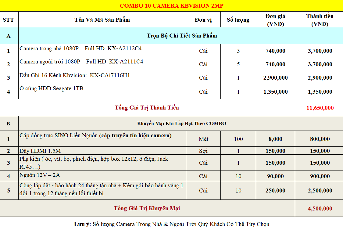 Khi mua combo camera 10 mắt Kbvision 2MP tại Viễn Thông TBA, quý khách hàng sẽ được sở hữu một bộ camera quan sát có dây chính hãng với giá cả hợp lý nhất. Tất cả các combo đều được hỗ trợ với chi phí tiết kiệm hơn so với mua riêng lẻ các sản phẩm, kèm theo đó là nhiều khuyến mại hấp dẫn. Chi tiết bạn có thể xem ở bảng dưới đây: