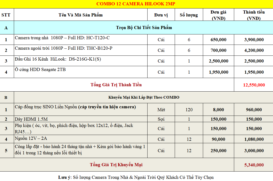 Khi mua bộ camera 12 mắt Hilook 2MP tại Viễn Thông TBA, quý khách hàng sẽ được sở hữu một bộ camera quan sát có dây chính hãng với giá cả hợp lý nhất. Tất cả các combo đều được hỗ trợ với chi phí tiết kiệm hơn so với mua riêng lẻ các sản phẩm, kèm theo đó là nhiều khuyến mại hấp dẫn. Chi tiết bạn có thể xem ở bảng dưới đây: