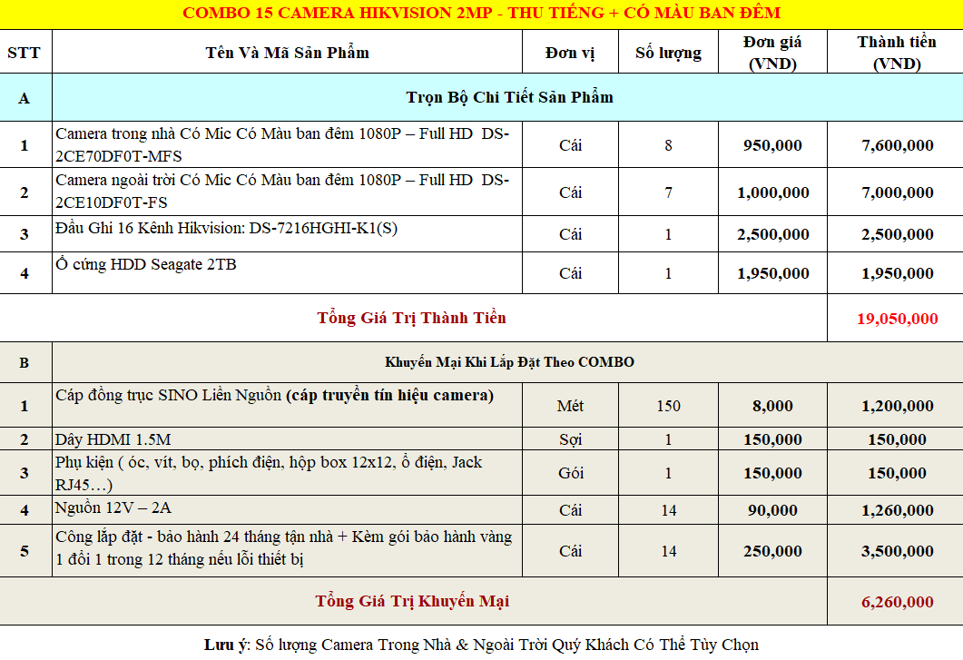Khi mua trọn bộ camera 15 mắt hikvision có âm thanh, có màu tại Viễn Thông TBA quý khách sẽ được sở hữu một bộ camera quan sát có dây chính hãng với giá cả tiết kiệm hơn khi mua riêng lẻ từng sản phẩm. Chi tiết bảng giá thi công lắp đặt camera sẽ được cập nhật ở dưới đây: