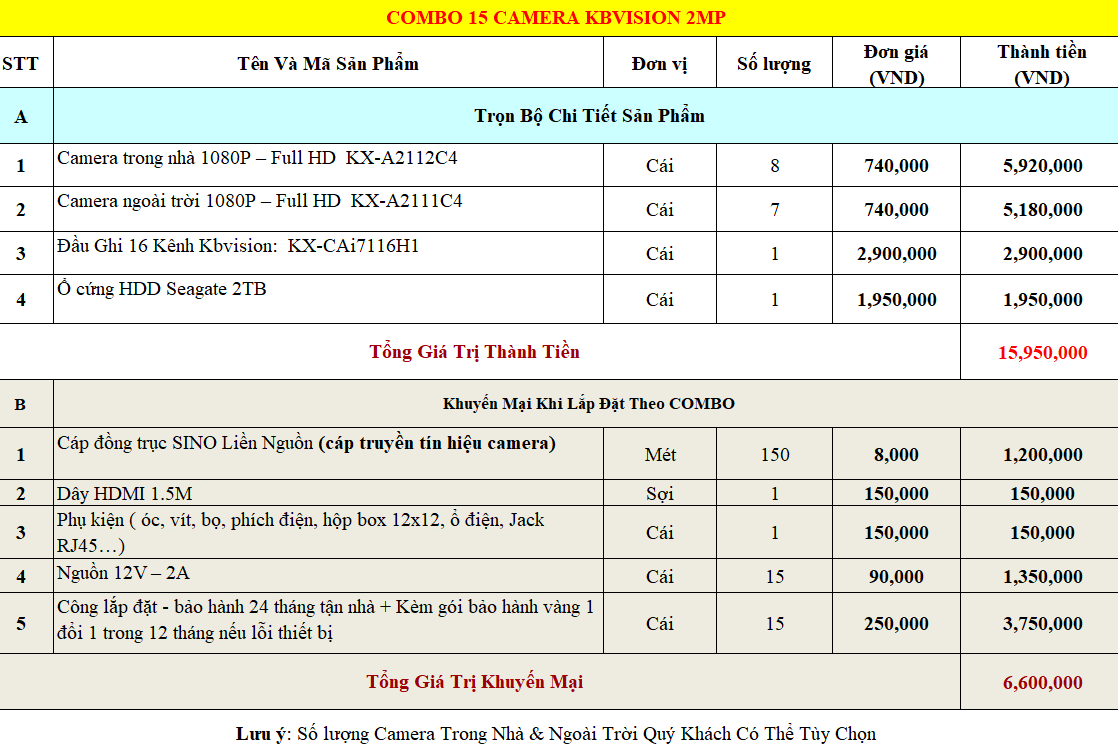 Khi mua combo camera 15 mắt Kbvision 2MP tại Viễn Thông TBA, quý khách hàng sẽ được sở hữu một bộ camera quan sát có dây chính hãng với giá cả hợp lý nhất. Tất cả các combo đều được hỗ trợ với chi phí tiết kiệm hơn so với mua riêng lẻ các sản phẩm, kèm theo đó là nhiều khuyến mại hấp dẫn. Chi tiết bạn có thể xem ở bảng dưới đây: