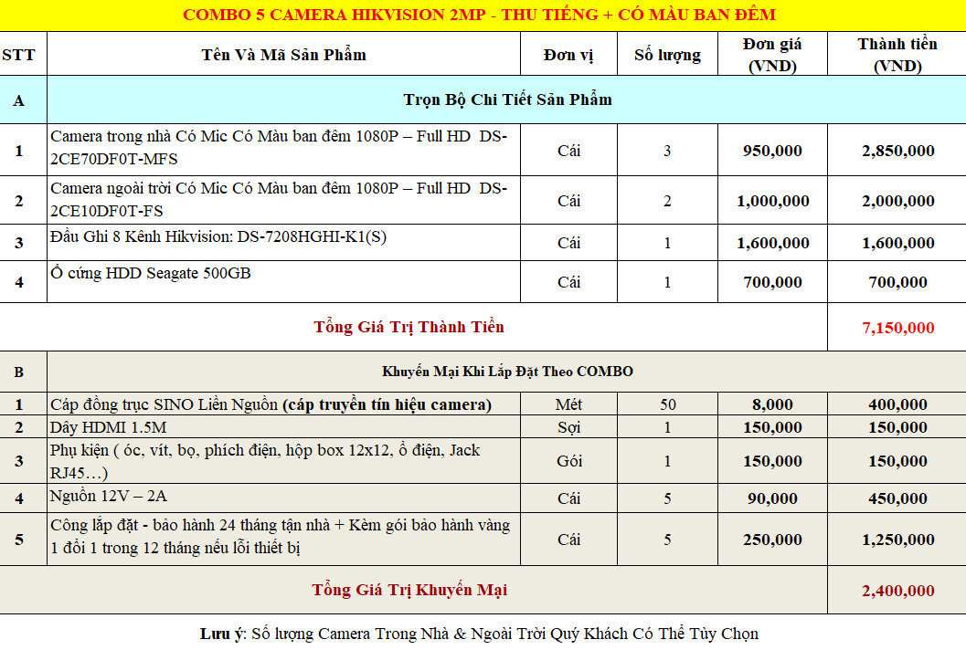 Khi mua trọn bộ camera 5 mắt hikvision có âm thanh, có màu tại Viễn Thông TBA quý khách sẽ được sở hữu một bộ camera quan sát có dây chính hãng với giá cả tiết kiệm hơn khi mua riêng lẻ từng sản phẩm. Chi tiết bảng giá thi công lắp đặt camera sẽ được cập nhật ở dưới đây: