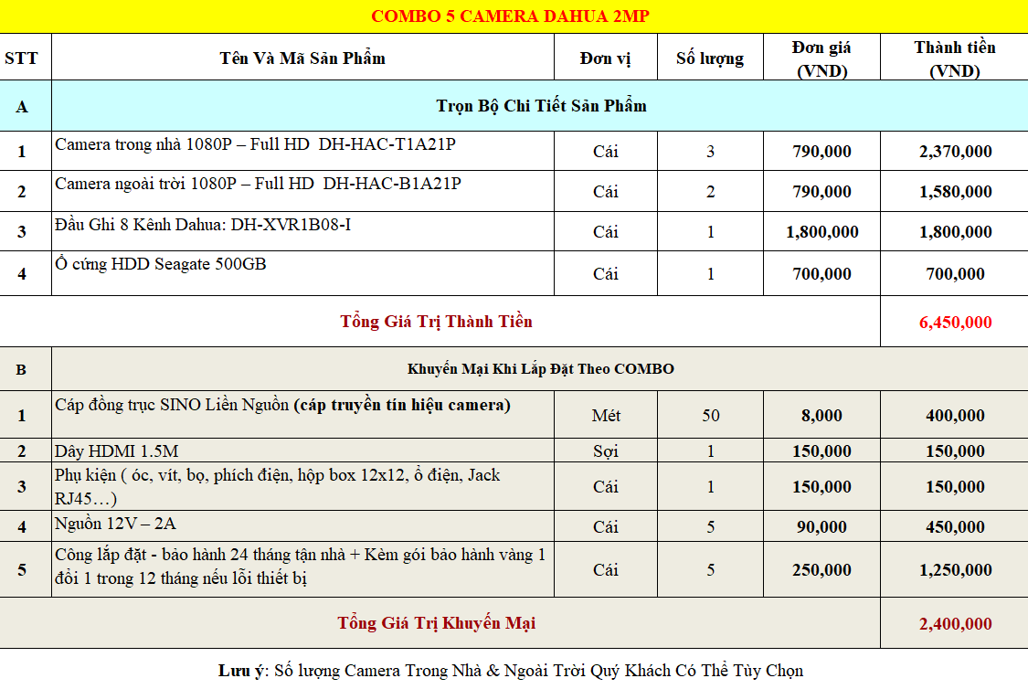 Khi mua combo camera 5 mắt Dahua 2MP tại Viễn Thông TBA, quý khách hàng sẽ được sở hữu một bộ camera quan sát có dây chính hãng với giá cả hợp lý nhất. Tất cả các combo đều được hỗ trợ với chi phí tiết kiệm hơn so với mua riêng lẻ các sản phẩm, kèm theo đó là nhiều khuyến mại hấp dẫn. Chi tiết bạn có thể xem ở bảng dưới đây: