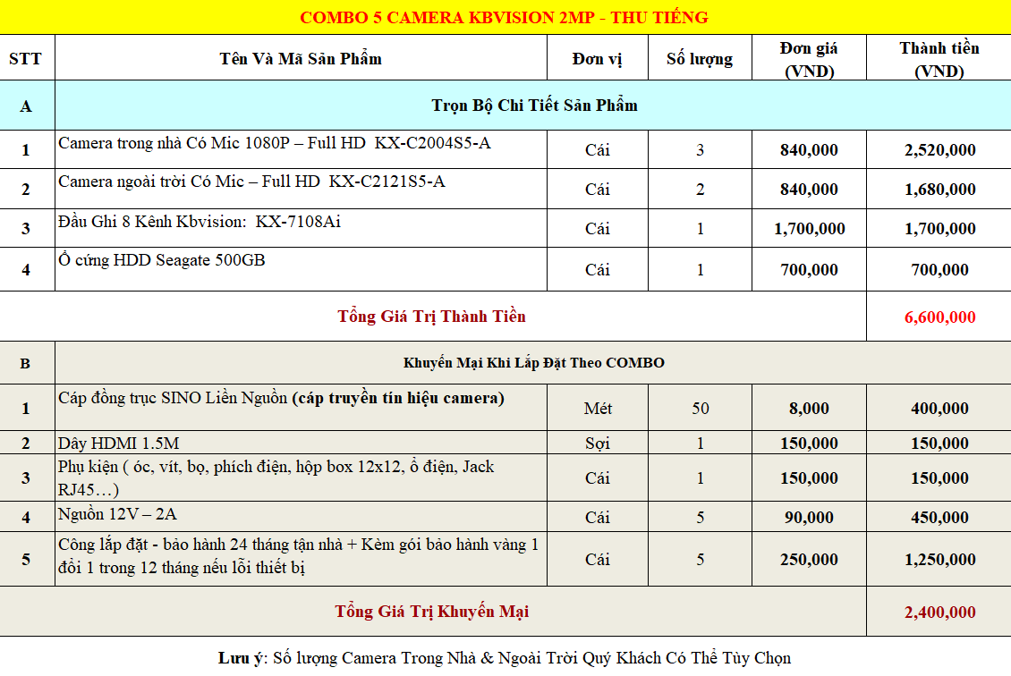 Khi mua combo camera 5 mắt có âm thanh Kbvision 2MP tại Viễn Thông TBA, quý khách hàng sẽ được sở hữu một bộ camera quan sát có dây chính hãng với giá cả hợp lý nhất. Tất cả các combo đều được hỗ trợ với chi phí tiết kiệm hơn so với mua riêng lẻ các sản phẩm, kèm theo đó là nhiều khuyến mại hấp dẫn. Chi tiết bạn có thể xem ở bảng dưới đây: