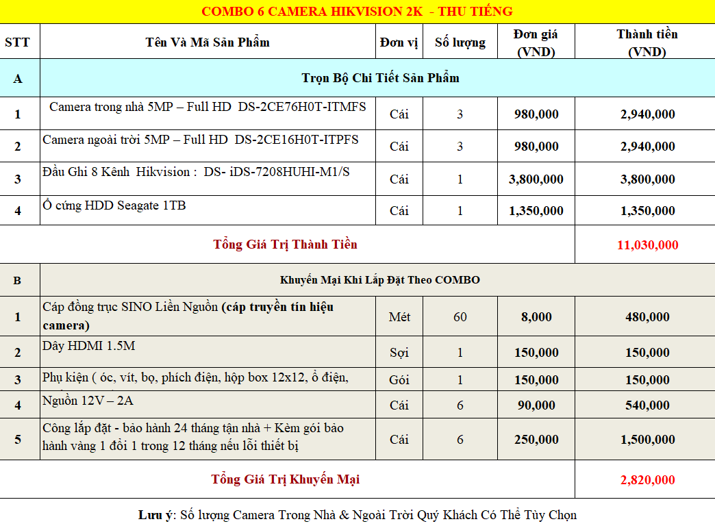 Khi mua trọn bộ 6 camera Hikvision 5MP có âm thanh tại Viễn Thông TBA quý khách sẽ được sở hữu một bộ camera quan sát có dây chính hãng với giá cả tiết kiệm hơn khi mua riêng lẻ từng sản phẩm. Chi tiết bảng giá thi công lắp đặt camera sẽ được cập nhật ở dưới đây: