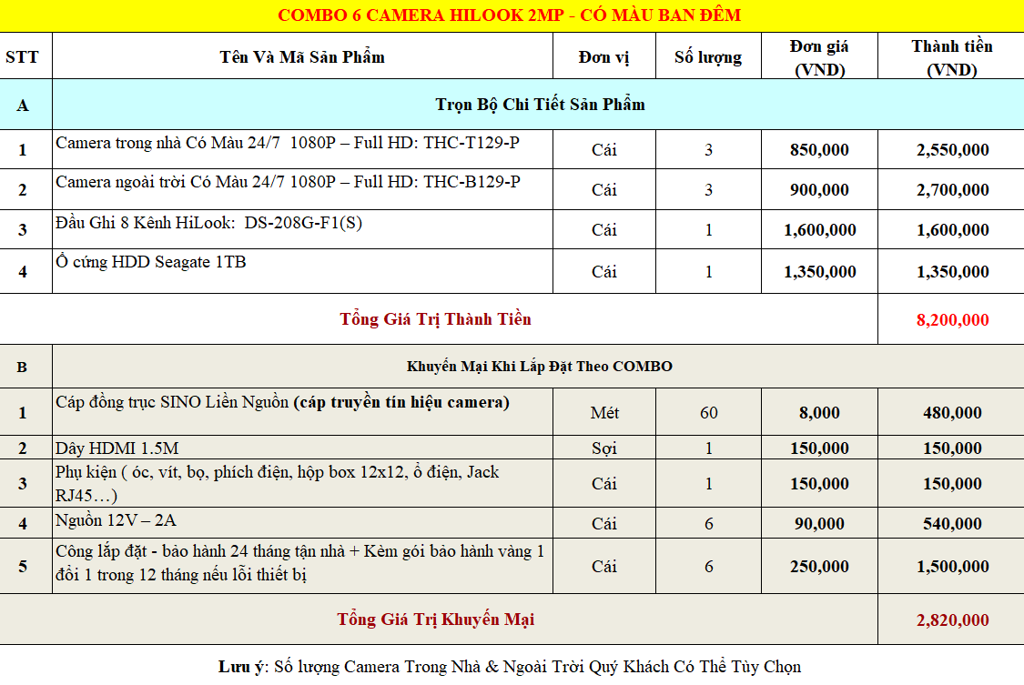 Khi mua bộ camera 6 mắt Hilook 2MP Có Màu Ban Đêm tại Viễn Thông TBA, quý khách hàng sẽ được sở hữu một bộ camera quan sát có dây chính hãng với giá cả hợp lý nhất. Tất cả các combo đều được hỗ trợ với chi phí tiết kiệm hơn so với mua riêng lẻ các sản phẩm, kèm theo đó là nhiều khuyến mại hấp dẫn. Chi tiết bạn có thể xem ở bảng dưới đây: