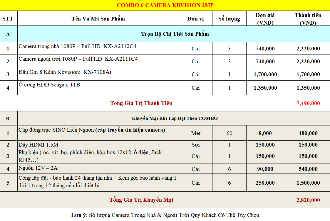 Khi mua combo camera 6 mắt Kbvision 2MP tại Viễn Thông TBA, quý khách hàng sẽ được sở hữu một bộ camera quan sát có dây chính hãng với giá cả hợp lý nhất. Tất cả các combo đều được hỗ trợ với chi phí tiết kiệm hơn so với mua riêng lẻ các sản phẩm, kèm theo đó là nhiều khuyến mại hấp dẫn. Chi tiết bạn có thể xem ở bảng dưới đây: