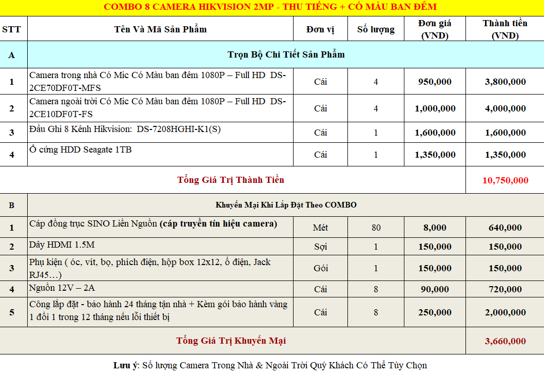 Khi mua trọn bộ camera 8 mắt hikvision có âm thanh, có màu tại Viễn Thông TBA quý khách sẽ được sở hữu một bộ camera quan sát có dây chính hãng với giá cả tiết kiệm hơn khi mua riêng lẻ từng sản phẩm. Chi tiết bảng giá thi công lắp đặt camera sẽ được cập nhật ở dưới đây: