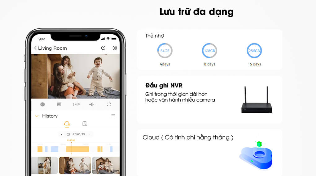 IPC-S2XP-6M0WED có khả năng lưu trữ với hai chế độ: Thẻ nhớ (tối đa 256GB) hoặc Cloud (dịch vụ đám mây) giúp người dùng có thể tùy ý lựa chọn tính năng lưu trữ.
